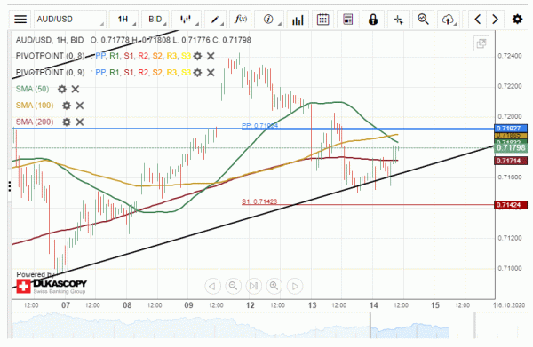 Currently, the exchange rate is trading near the bottom border of the channel pattern at 0.7166 and could be set for a breakout.