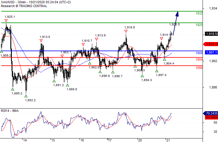 Our preference Long positions above 1908.00 with targets at 1925.00 & 1932.00 in extension.
