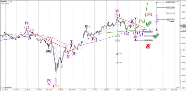 AUD/USD is building a choppy and corrective pattern. This is typical for a wave 4 (pink) and an uptrend continuation is around the corner.
