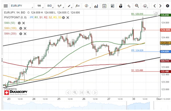 As for the near future, the exchange rate could continue to edge higher in an ascending channel pattern. The possible target for bullish traders would be near the weekly resistance level at 125.01.