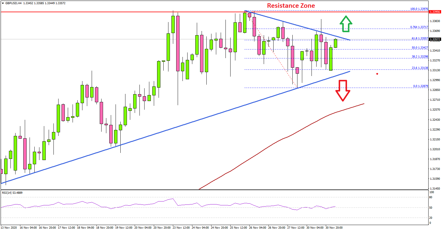 Looking at the 4-hours chart, the pair formed a high near the 1.3397 level before it corrected lower. There was a break below the 1.3340 support, but the pair remained well above the 200 simple moving average (green, 4-hours) and the 100 simple moving average (red, 4-hours).
