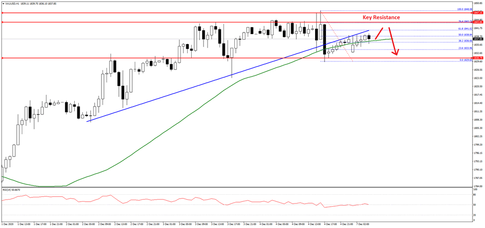 There was also a close above the $1,825 level and the 50 hourly simple moving average. However, the price seems to be facing a strong resistance near the $1,845 and $1,850 levels. Recently, there was a minor downside correction below $1,840 on FXOpen and a connecting bullish trend line on the hourly chart.
