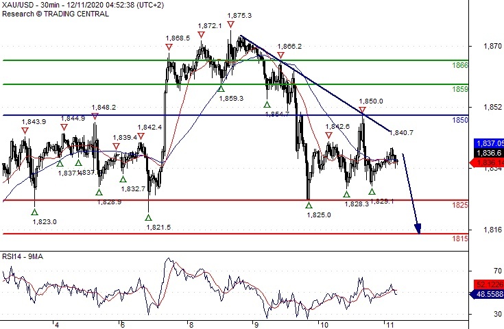 Our preference Short positions below 1850.00 with targets at 1825.00 & 1815.00 in extension.