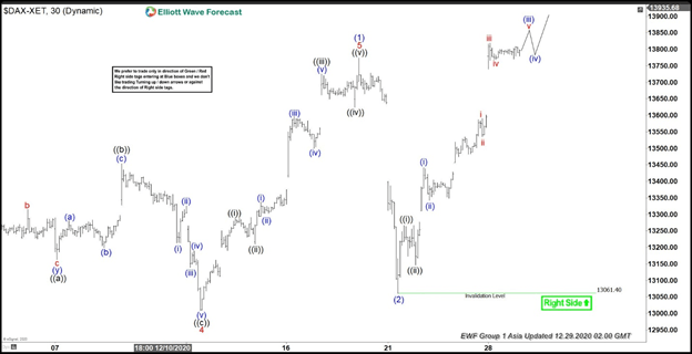 Rally from November 30 low in DAX ended at 13774.45 as an impulse Elliott Wave structure. This 5 waves rally completed wave (1) in Intermediate degree. Pullback in wave (2) has also ended at 13061.40. Index has since resumed higher in wave (3) . It broke above wave (1) high, confirming the next bullish cycle has started. Up from wave (2) low at 13061.40, wave ((i)) ended at 13266.49 and pullback in wave ((ii)) ended at 13146.50.