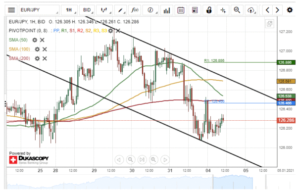 The Eurozone single currency has declined by 0.59% against the Japanese Yen since December 31. The currency pair breached the 100– and 200– hour SMAs during this period.