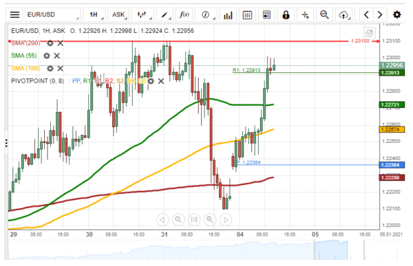 During Monday morning hours, the EUR/USD currency pair pierced the weekly R1 at 1.2291.