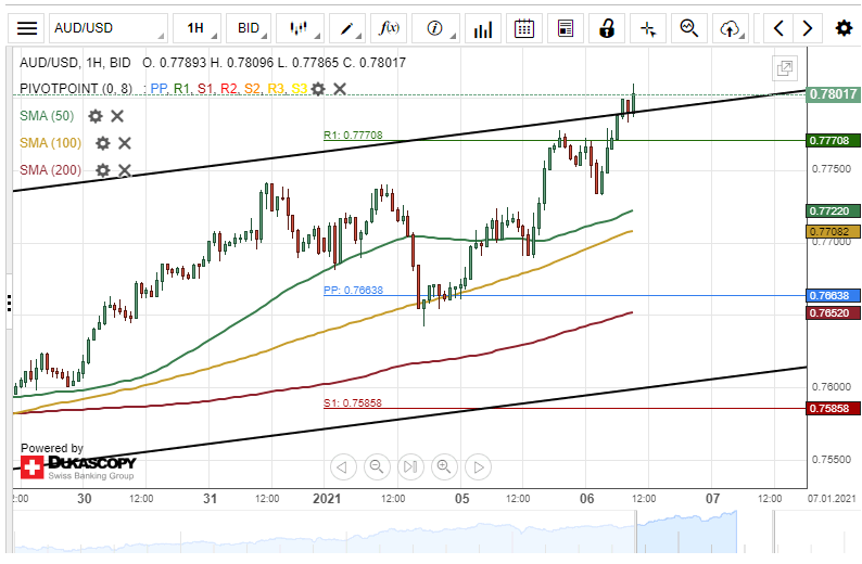 The Australian Dollar has edgd higher by 134 pips or 1.75% against the US Dollar since Tuesday’s trading sessions. The currency pair tested the upper boundary of an ascending channel pattern at 0.7795 during the London open on Wednesday.