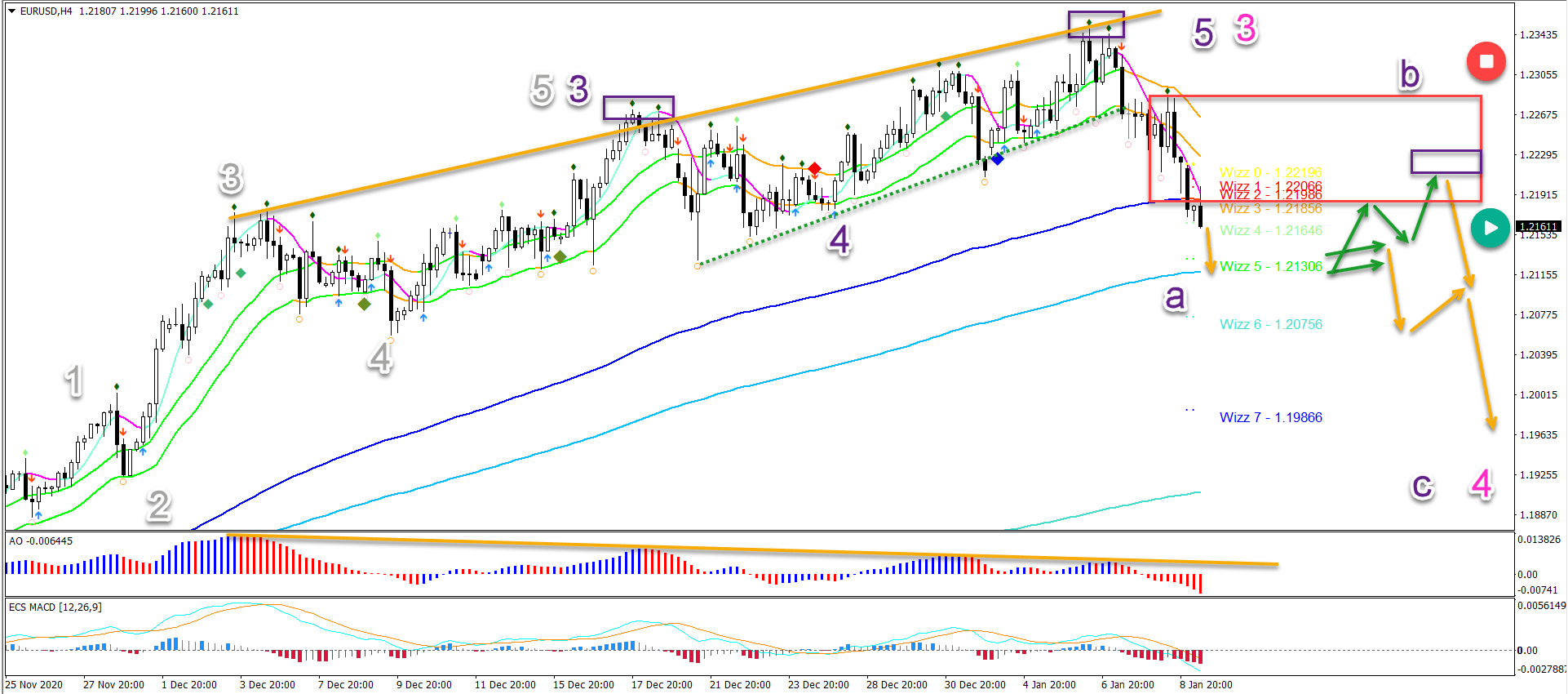 EUR/USD rising wedge chart pattern is confirming a bearish reversal or retracement. How long can the bears keep control before the bulls step in? A head and shoulders pattern (purple boxes) could further aid the bears for a move down towards the wizz 7 target around 1.20.