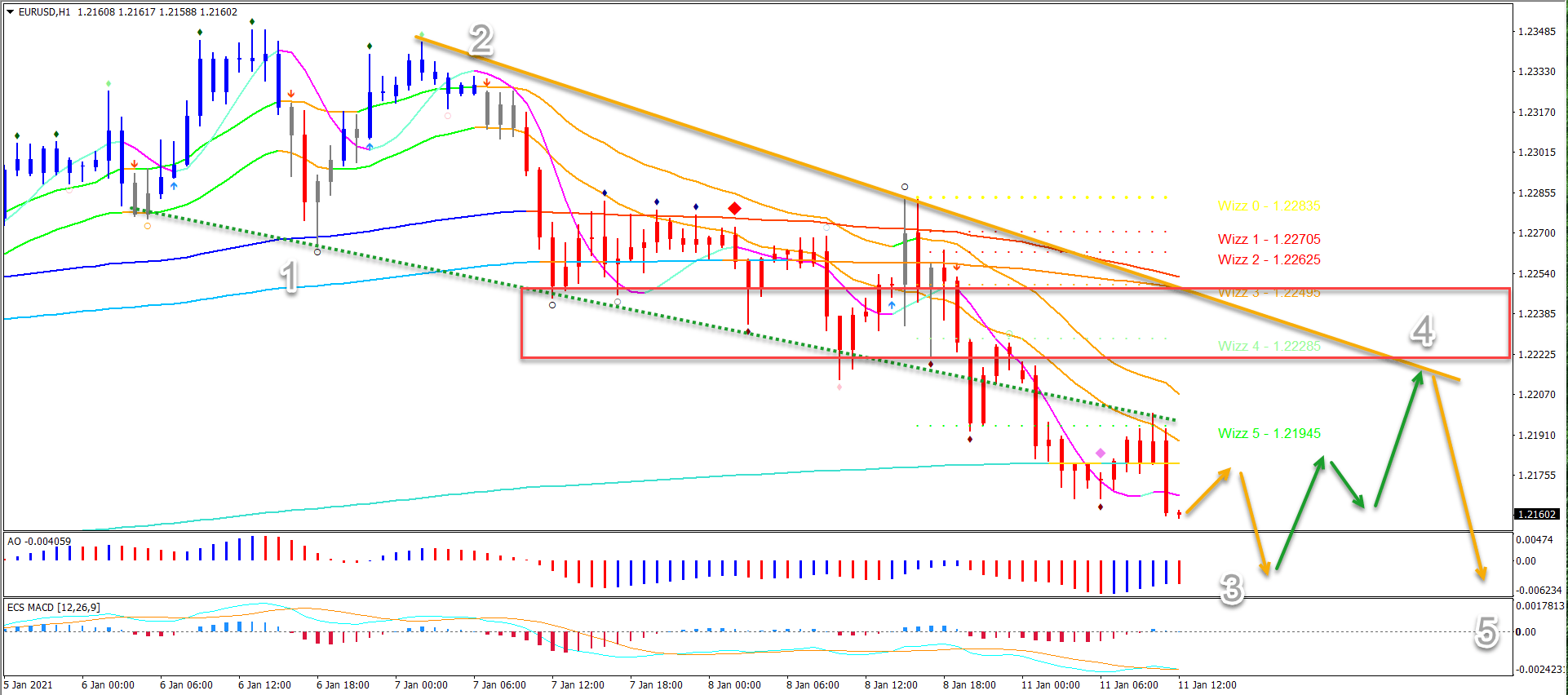 On the 1 hour chart, price action could build a 5 wave pattern (grey). Once the wave 3 is completed, a bullish pullback in wave 4 towards the resistance line (orange) is likely.