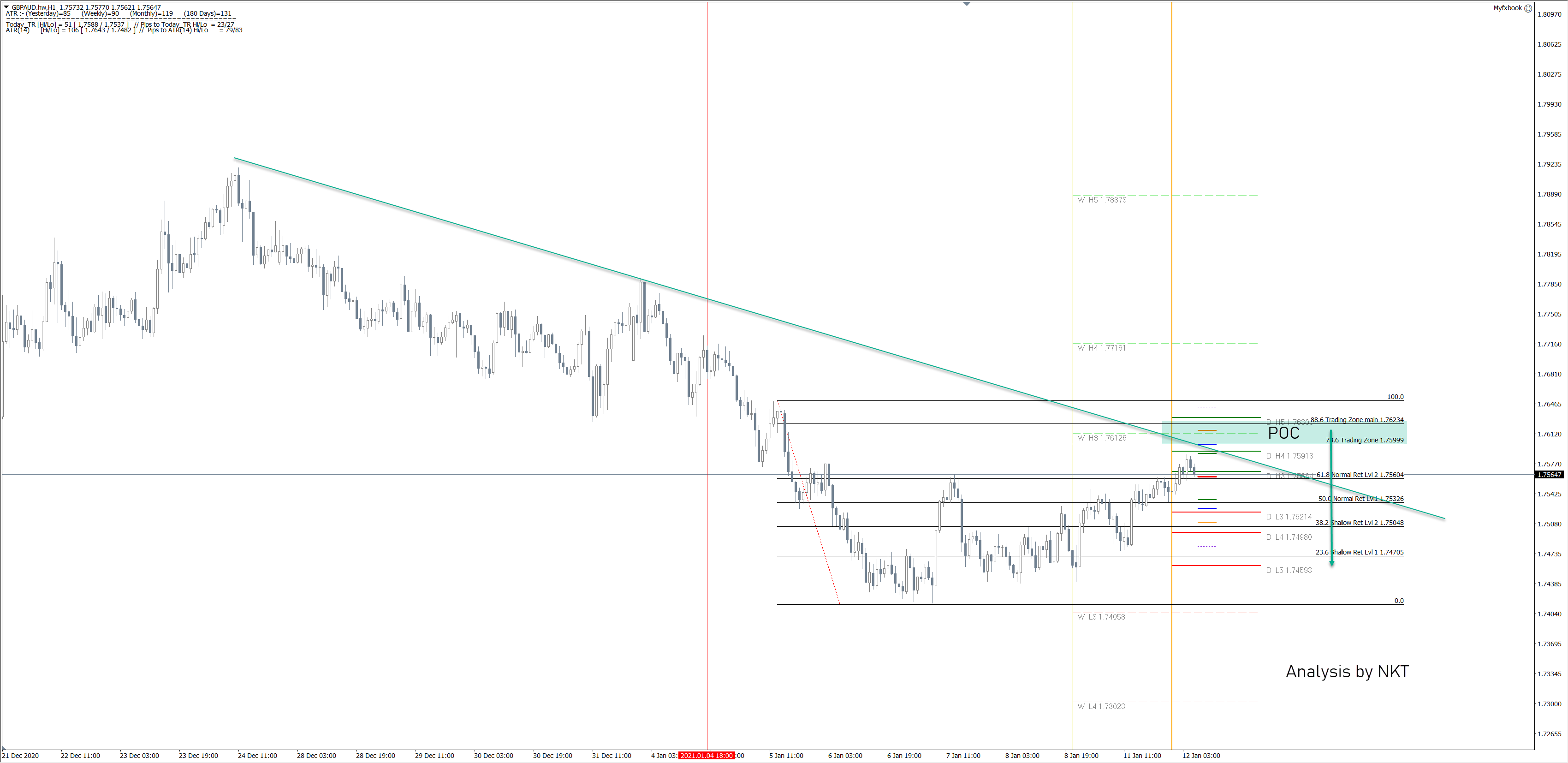 The POC zone 1.7599-1.7623 is additionally supported by the W H3 camarilla pivot. We can also see the D H5 resistance which adds to existing confluence. The pair should make a move down towards 1.7521 and 1.7480. If the targets are reached then it will be a decisive point for the pair. Either continuation down to 1.7459 or a move to the upside as a retracement again.