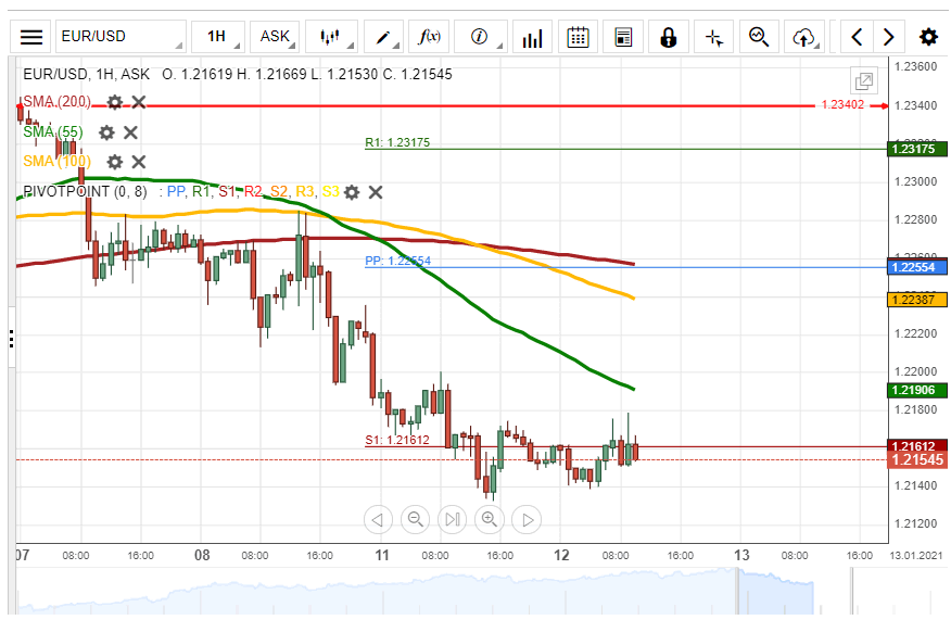Since Monday afternoon, the EUR/USD currency pair has been trading sideways around the weekly S1 at 1.2161.