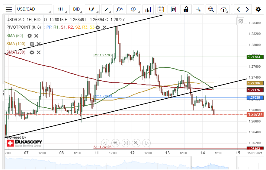 Given that a breakout had occurred, the USD/CAD exchange rate could continue to edge lower during the following trading session. The possible target for bears would be near the weekly support level at 1.2610.