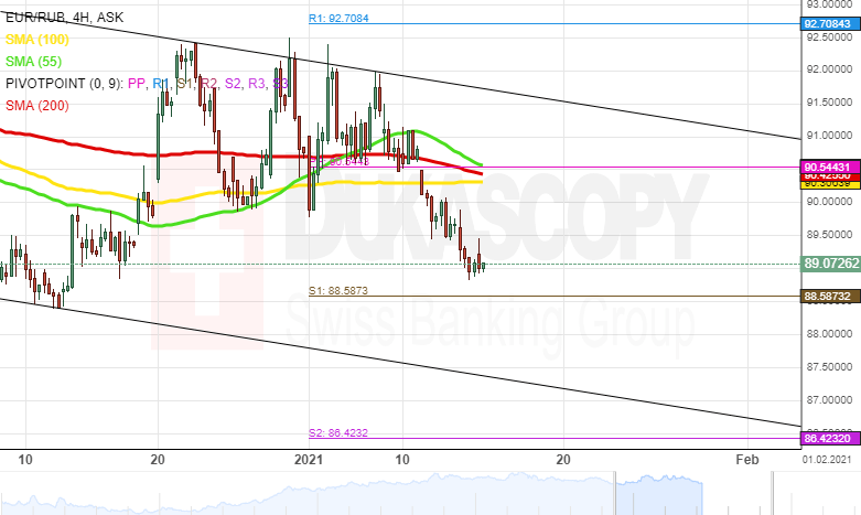 Since October, the EUR/RUB exchange rate has been trading within a descending channel.