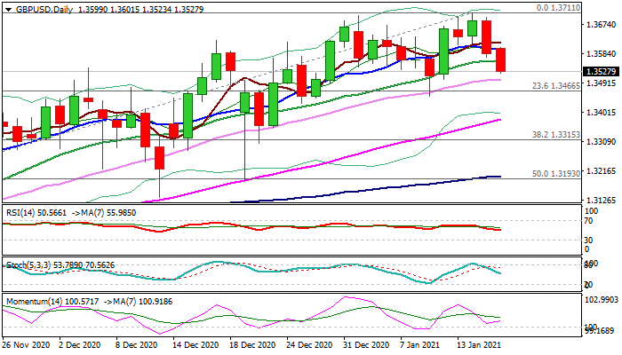 Fresh weakness broke below 20DMA (1.3560), softening near-term structure, with daily close below here to signal top and increase risk of testing pivotal supports at 1.3466/51 (Fibo 23.6% of 1.2675/1.3711 / Dec 11 trough).