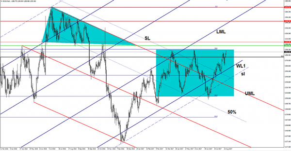 Price rallies as the USD is going down again, you can see that is almost to hit the 23.6% retracement level and the $1295 per ounce. A breakout from the extended sideways movement is favored after the aggressive jump above the 38.2% retracement levels. Technically is expected to climb much higher after the failure to retest the warning line (WL1).