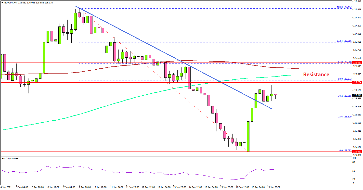 - EUR/JPY started a fresh upward move from the 125.00 support zone.
