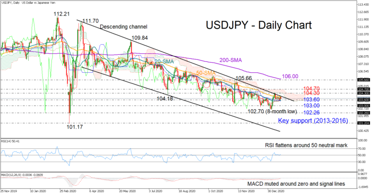 The RSI and the MACD remain flat around their neutral levels, whereas the bullish cross between the red Tenkan-sen and Blue Kijun-sen lines is currently providing hope that the next move in the price could be positive. The latter, however, awaits a confirmation above the 104.00 number and the channel’s topline, while a rally beyond the 104.30 – 104.70 restrictive area and the Ichimoku cloud is expected to stretch towards the 105.66 resistance.