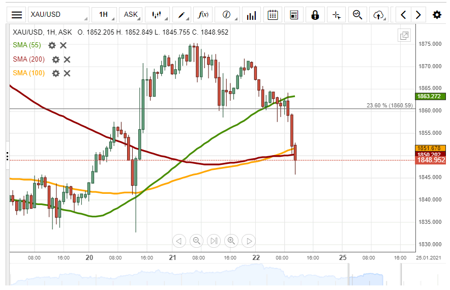 It is likely gold could gain support from the 100– and 200-hour moving averages near 1,850.00 and trade upwards in the short term. In this case the price for gold could target the psychological level at 1,890.00.