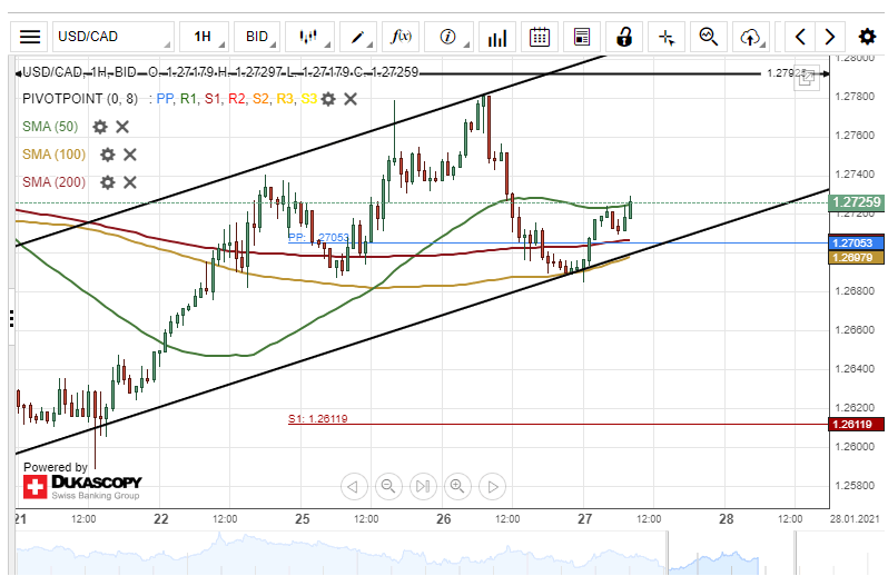 Given that the exchange rate is currently trading near the lower boundary of an ascending channel pattern at 1.2711, a breakout could occur within this session.