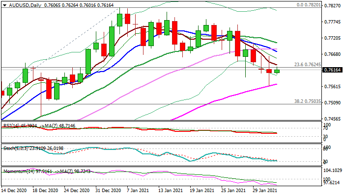 Repeated close below broken Fibo support at 0.7624 (23.6%) is needed to keep near-term bias with bears and guard pivotal barriers at 0.7660/75 (former higher base / falling 10DMA).