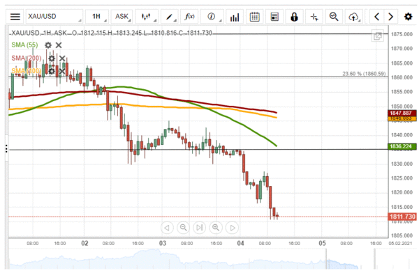 It is unlikely that bulls could prevail in the market, and the price for gold could exceed the 1,836.20/1,847.90 range due to the resistance area formed by the 55-, 100– and 200-hour SMAs.