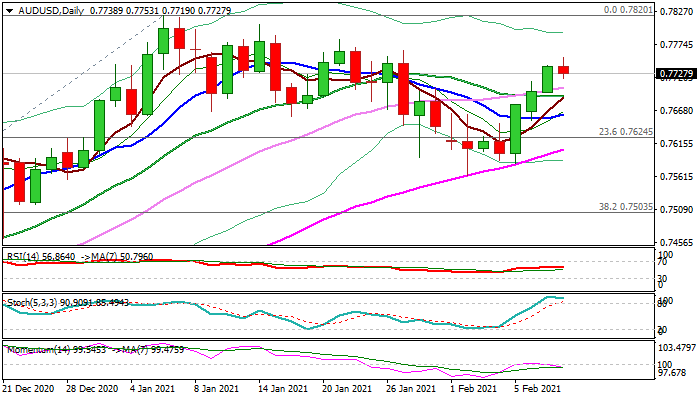 Fresh bulls are expected to position for fresh push higher as recent advance already retraced over 61.8% of 0.7820/0.7563 pullback, as the action remains well supported by rising and thickening daily cloud, however, daily MA’s haven’t fully returned to bullish setup, stochastic is overbought and lack of positive momentum keeps in play risk of stall.