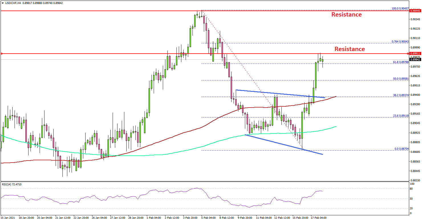Any more gains could lead the pair towards the 0.9000 hurdle. A close above 0.9000 could start a strong increase. If not, there is a risk of a fresh decline towards the 0.8920 and 0.8900 support levels. The 200 simple moving average (green, 4-hours) is also near the 0.8900 level to provide support.