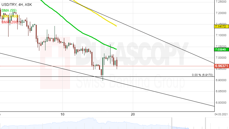 Since the middle of November, the USD/TRY currency pair has been trading downwards within a falling wedge pattern.
