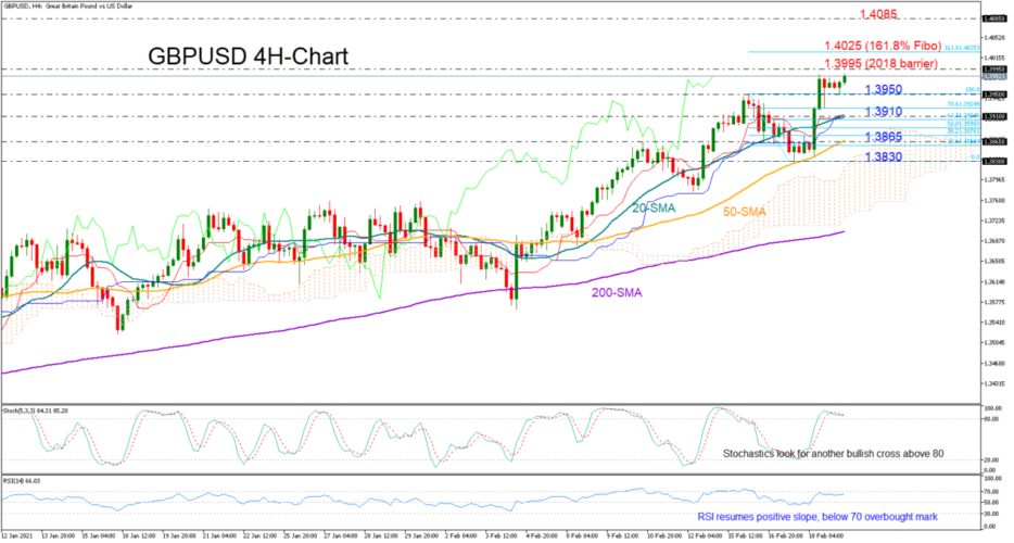 The ongoing narrow sideways move brings to mind a bullish rectangle pattern in a lower timeframe (1-hour chart), foreseeing the continuation of the bullish trend. That said, we cannot rule out a delayed upside breakout as the price is in breathing distance underneath the 1.3995 barrier which troubled the market in early 2018. A decisive close above it could send resistance up to the 161.8% Fibonacci extension of the latest pullback at 1.4025, while slightly higher the 1.4085 could be another hurdle ahead of 1.4150.