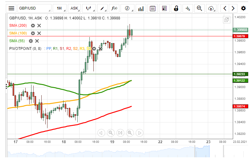 On the other hand, the pair should consolidate its gains by retracing down to the pivot point at 1.3988 or trading sideways above the 1.4000 mark until the simple moving averages catch up.