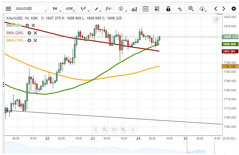 Since Tuesday, the XAU/USD exchange rate has been consolidating in the 1,810.00 area.