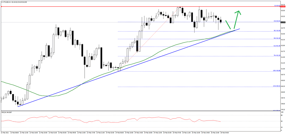 The price traded as high as $63.67 and it is currently consolidating gains. On the downside, there is a decent support forming near the $62.50 level and the 50 hourly simple moving average. There is also a major bullish trend line forming with support at $62.50 on the hourly chart on FXOpen.