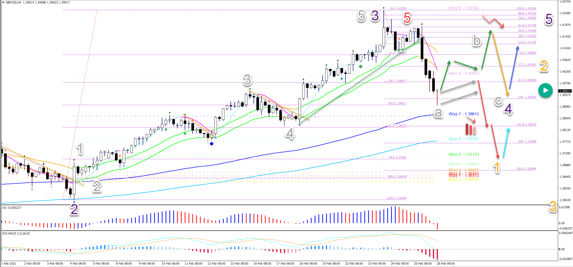A strong bullish bounce could create a bullish ABC up (blue arrows). Whereas a bear flag (grey arrows) should send the GU pair lower again in a wave 345