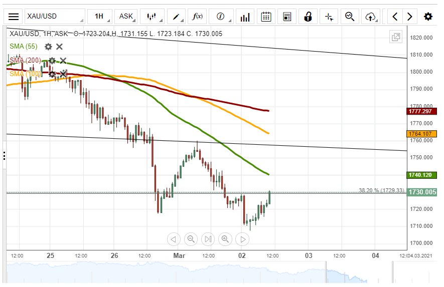 The recovery of the rate was approaching the 38.20% Fibonacci retracement level at 1,729.33, which had provided resistance at midnight to Tuesday. In the meantime, the rate was being approached from above by the 55-hour simple moving average. The combination of these levels could cause a decline, which would test the support of the 1,710.00 and 1,700.00 levels.