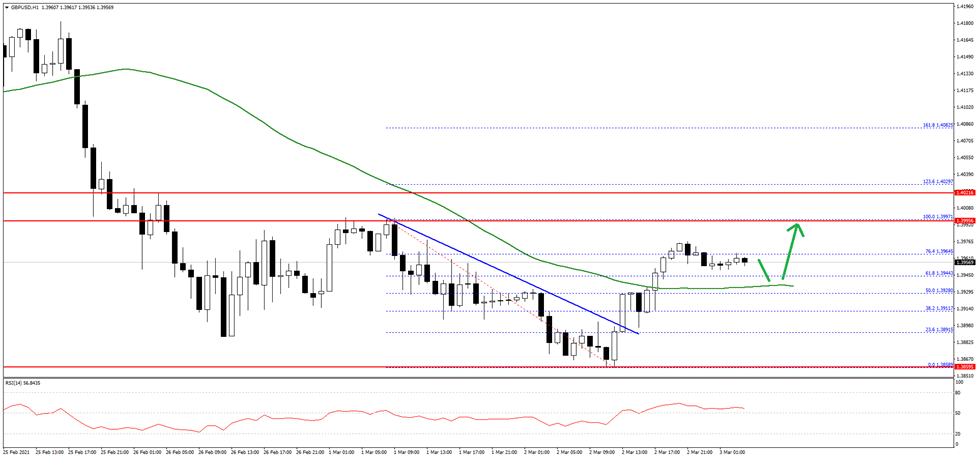 The pair traded as low as 1.3858 and it is currently correcting higher. There was a break above a connecting bearish trend line at 1.3890 on the hourly chart. The pair even recovered above 1.3920 and the 50 hourly simple moving average.