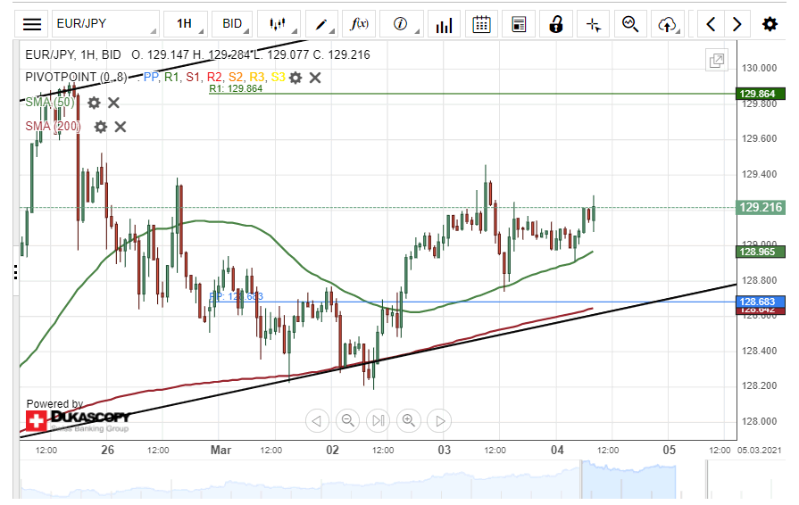 The EUR/JPY exchange rate is likely to edge higher within the following trading session. The potential target for bullish traders would be near the weekly resistance level at 129.86.