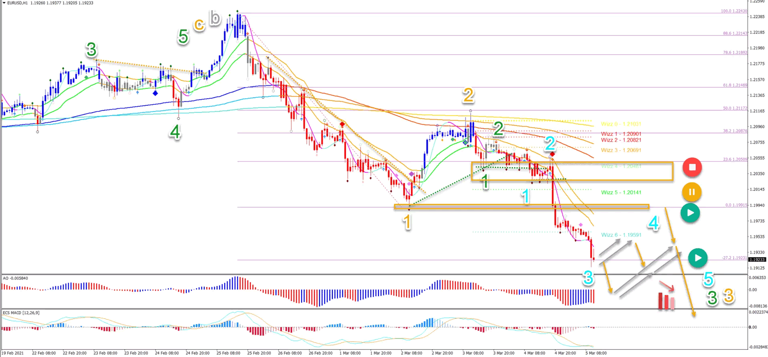 The EUR/USD bearish breakout was already anticipated in our ABC zigzag forecast. The only difference was that the wave 2 (orange) on the 1 hour chart ended sooner than expected.