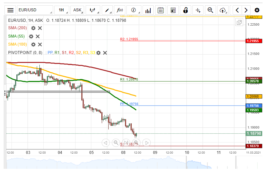 On Monday morning, the EUR/USD declined below the support of the 1.1900 mark. Next target for the decline was the 1.1850 mark and the weekly S1 simple pivot point at 1.1838.