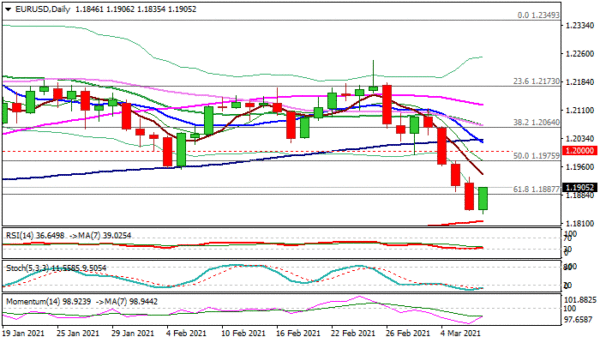 The Euro bounces from new 3 ½ low (1.1835) on Tuesday, as steep fall in past four days stalled on approach to 200DMA (1.1816), offsetting for now bearish signal on Monday’s close below 1.1887 (Fibo 61.8% of 1.1602/1.2349 upleg).