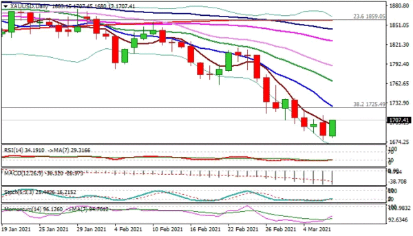 Spot gold rose from new nine-month low ($1676) on Tuesday, as dollar bulls are pausing and technical studies on daily chart are oversold, providing temporary support to the metal.