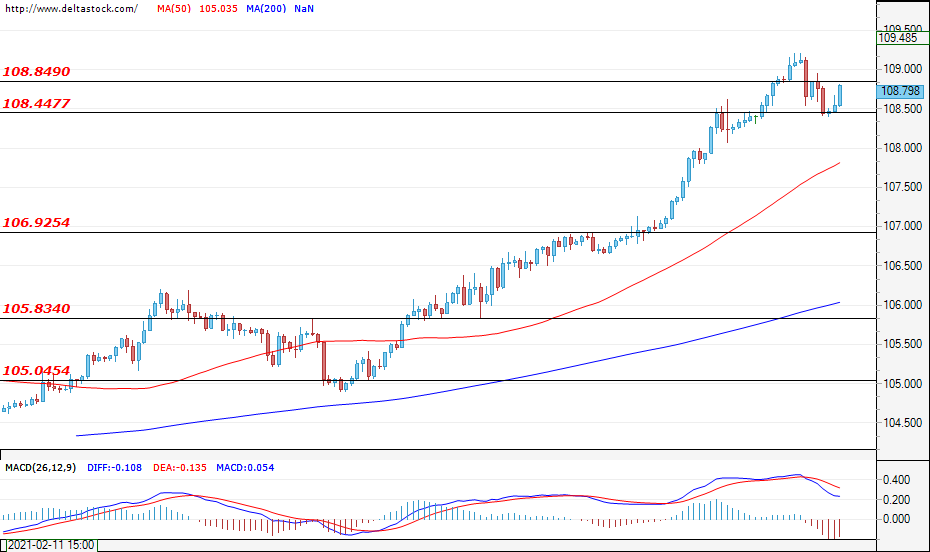 The unsuccessful breach of the support level at 108.50 put an end to the bearish correction and the bulls took back control. The expectations are for a test of the resistance zone at 108.85 which, if successful, could result in a continuation of the rally. In the opposite direction, a breach of the support at 108.44 could pave the way for the pair towards the lower support at 106.92.
