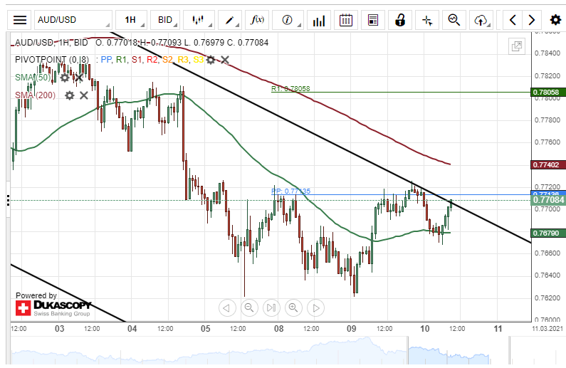 The Australian Dollar surged by 96 pips or 1.26% against the US Dollar on Tuesday. The currency pair tested the upper line of a descending channel pattern at 0.7713 during Tuesday’s trading session.