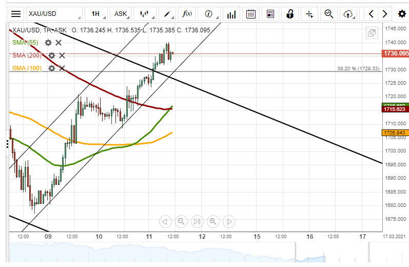 The yellow metal reached the 1,730.00 mark. Moreover, it broke this level’s resistance. In addition, the upper trend line of a large scale channel down pattern that had guided the rate since early February was broken.