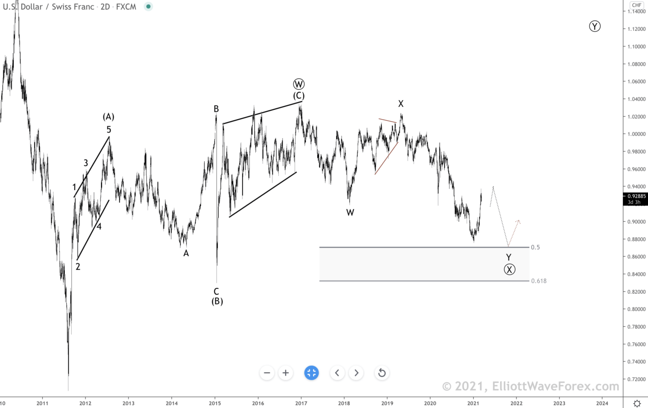 It seems like wave B is taking the form of a zigzag. If correct, the market should finish an upward impulse for wave ((a)) before wave ((b)) of B begins. Broadly, as shown on the two-day chart below, we’re likely going to have the rest of wave Y of ((X)), which might take a couple of months.