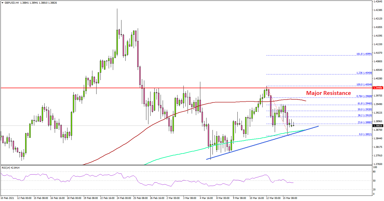Looking at the 4-hours chart, the pair recovered above the 1.3850 and 1.3880 resistance levels. However, the pair faced a strong resistance near the 1.4000 level and it also failed to stay above the 100 simple moving average (red, 4-hours).