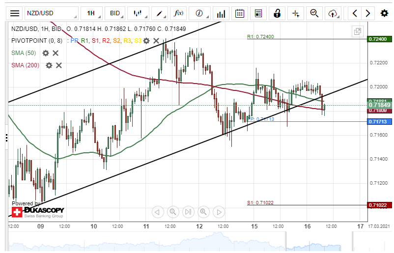 The New Zealand Dollar declined by 39 pips or 0.54% against the US Dollar on Monday. The currency pair breached the 50– and 200– hour SMAs during yesterday’s trading session.