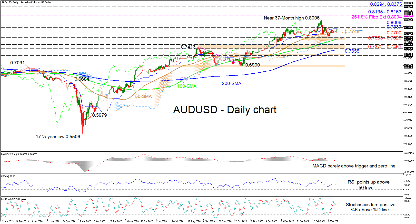Should the positive traction off the 50-day SMA gain impetus and clearly nudge the price above the immediate obstacle of 0.7837, the bulls could then propel the pair for a retest of the near 37-month top of 0.8006. Successfully resuming the ascent, buyers may encounter intense constraints from the 0.8094 level, which happens to be the 261.8% Fibonacci extension of the down leg from 0.7413 to 0.6990, and from the adjacent resistance band of 0.8135-0.8163 overhead. If the bulls power over these borders, the price may then aim for the 0.8294 high, identified in January 2015 and the 0.8375 barrier.