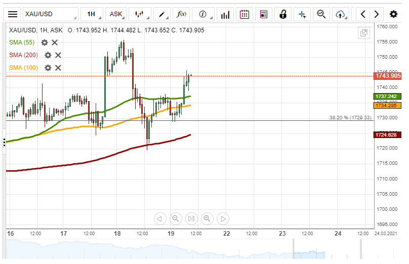 At mid-day on Thursday, the yellow metal’s price found support in the 200-hour simple moving average and the 1,720.00 level. Afterwards, a surge followed. By the start of Friday’s European trading hours, the metal had passed the resistance of the 55 and 100-hour SMAs and was testing the 1,740.00 mark.