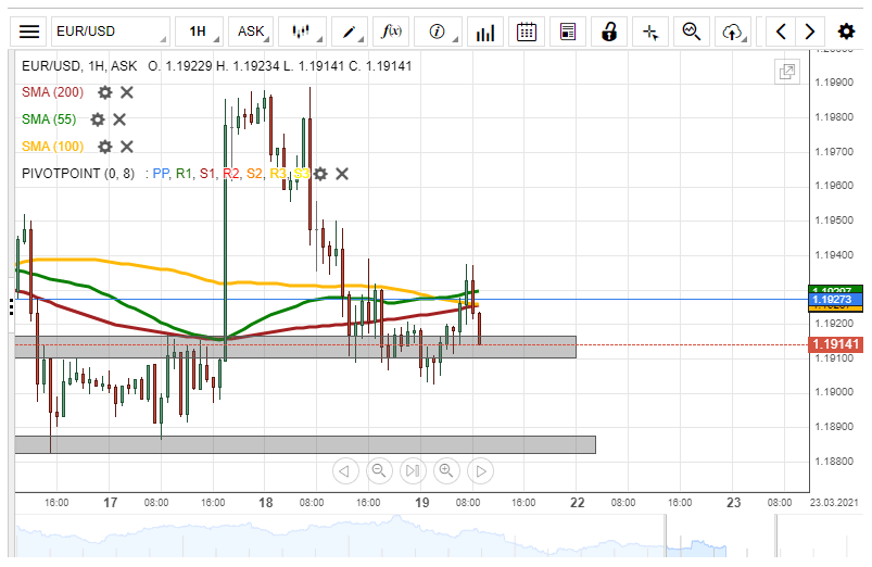 In the case of the 55, 100 and 200-hour simple moving averages and the weekly simple pivot point providing resistance, the rate would most likely again look for support in the 1.1900 level. If this level gets passed, the pair could reach the 1.1882/1.1887 zone.