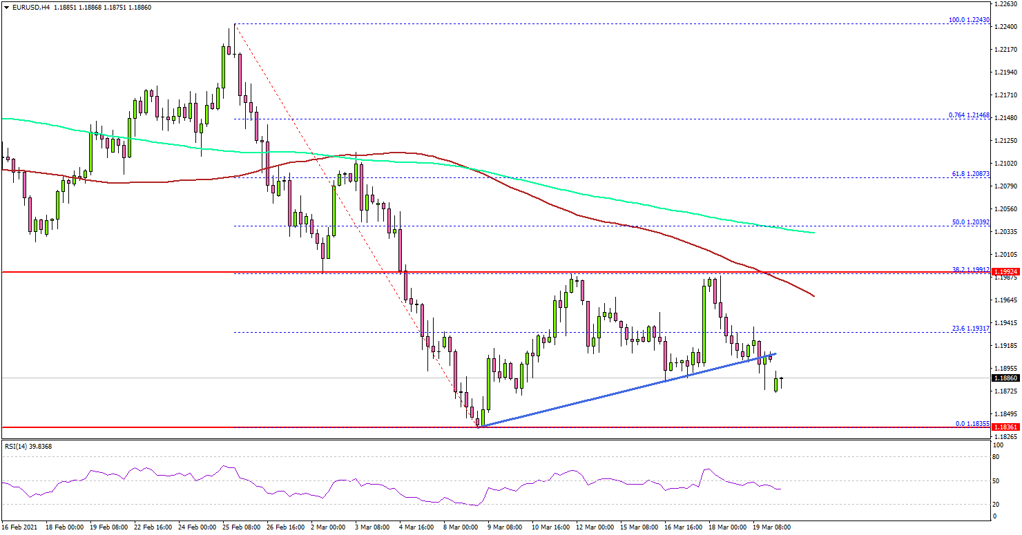 Recently, there was a fresh decline below the 1.1920 support zone. There was also a break below a connecting bullish trend line with support near 1.1900 on the same chart.